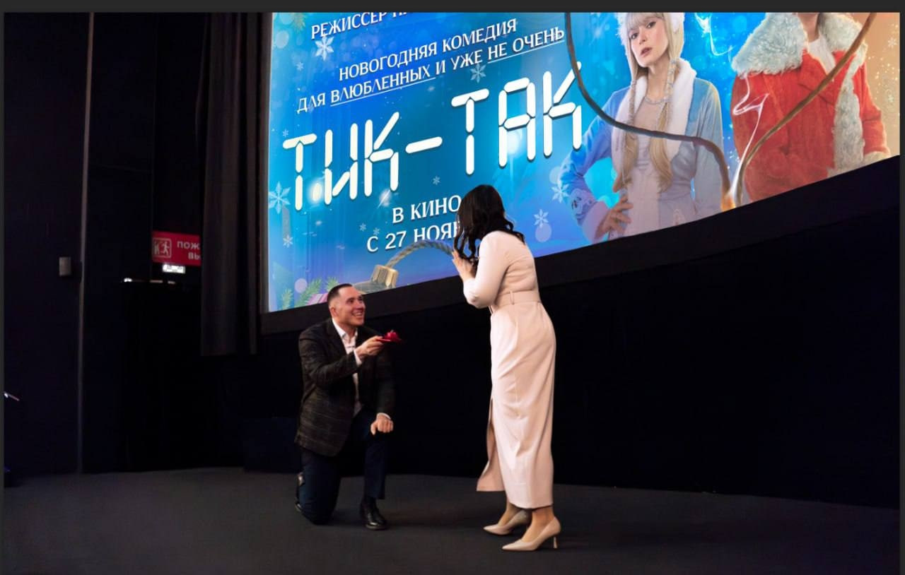 5 декабря показ фильма «Тик‑Так» превратился в настоящий праздник: после финальных кадров зритель сделал предложение своей любимой прямо в зале кинотеатра. История новогодней комедии о любви и втором шансе продолжилась в реальной жизни — под аплодисменты зрителей девушка сказала «Да».